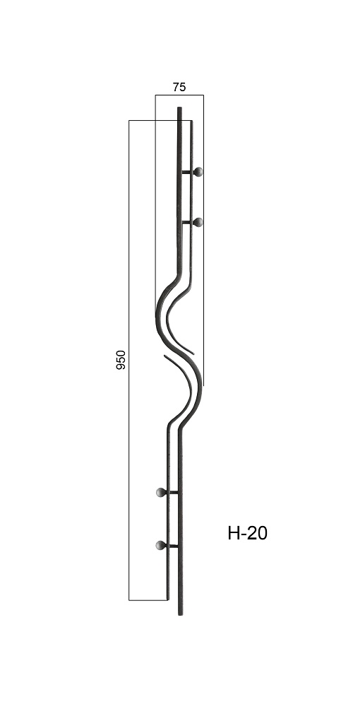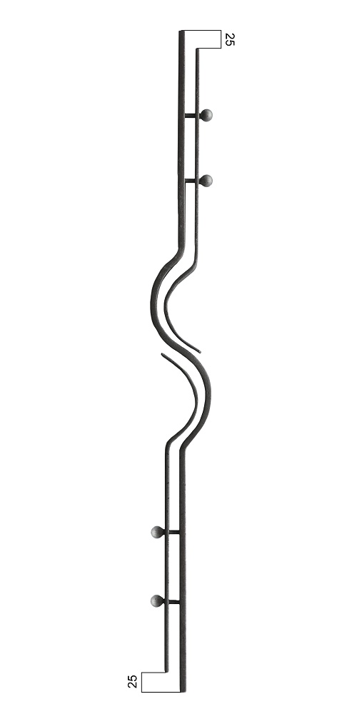 T006 - kovaná výplň zábradlí, plotu, brány, hladká ocel, délka 1000 mm, šířka 100 mm, středový profil materiál 20 x 10 mm, vnější profily 20 x 5 mm, průměr kuliček 20 mm. Bez povrchové úpravy.