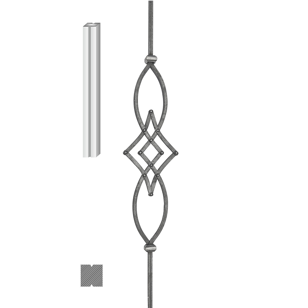 T103 - kovaná výplň zábradlí, tyč délky 950 mm z materiálu 12 x 12 mm, nýtovaný ornament 590 x 170 mm, materiál ornamentu 12 x 6 mm, hladká ocel bez povrchové úpravy.