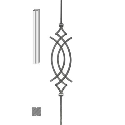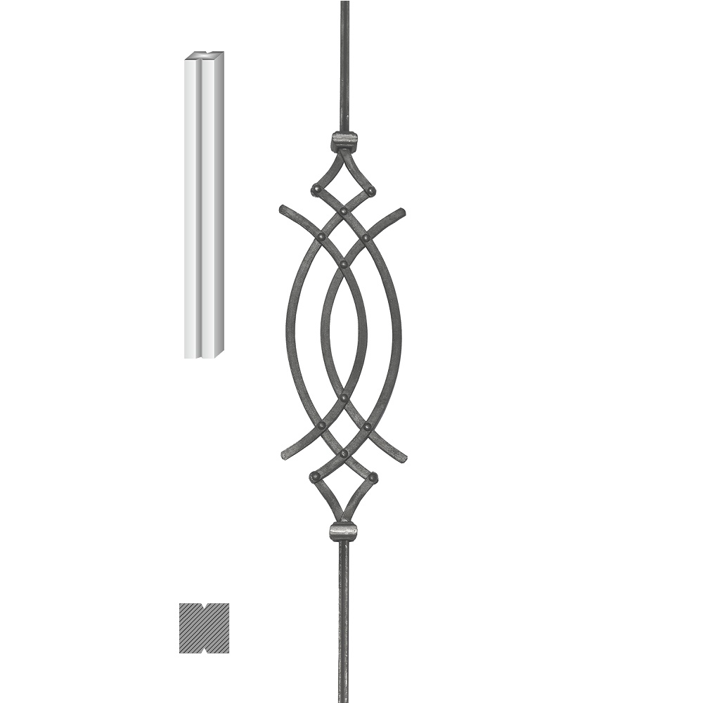 T107 - kovaná výplň zábradlí, tyč délky 950 mm z materiálu 12 x 12 mm, nýtovaný ornament 570 x 165 mm, materiál 12 x 6 mm, hladká ocel bez povrchové úpravy.