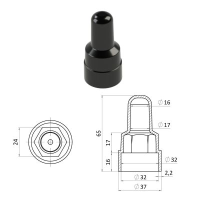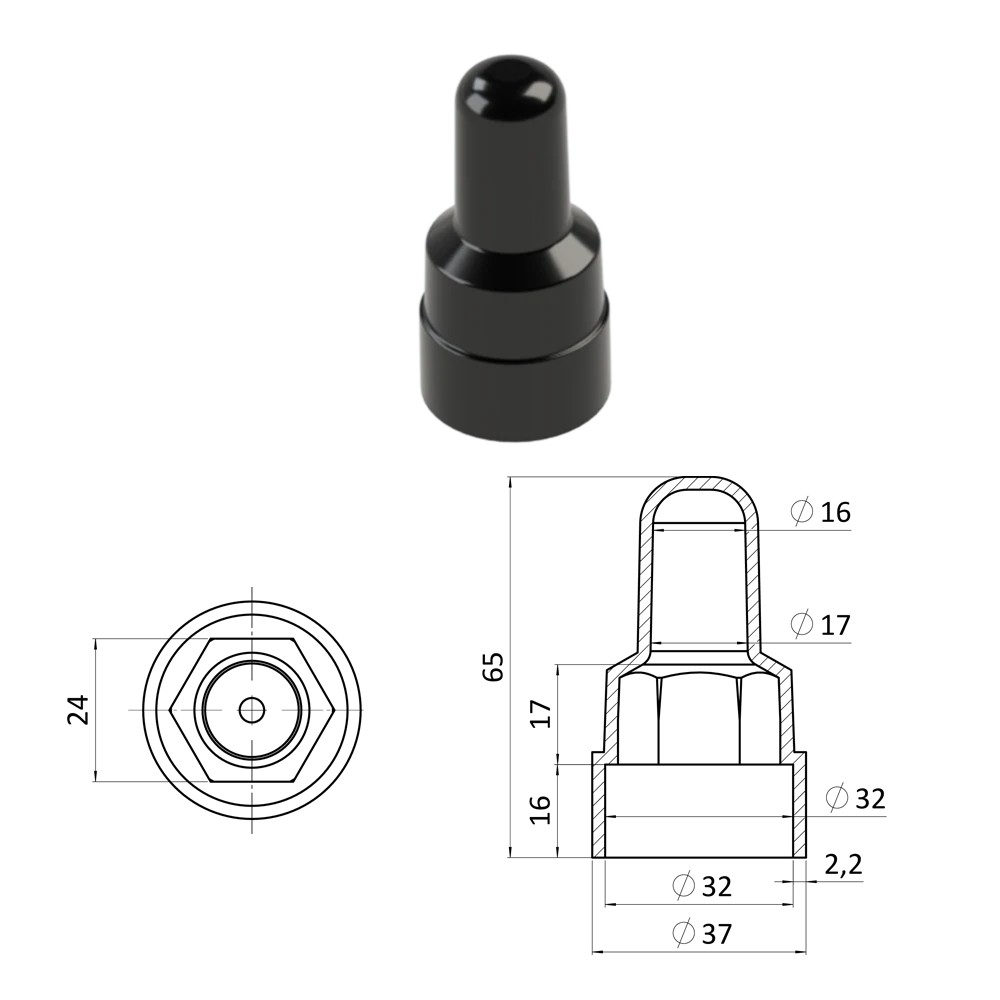 Prodloužená plastová krytka na matice a šrouby se závitem M16, výška 65 mm. Dodáváme v barvě černé RAL9005.