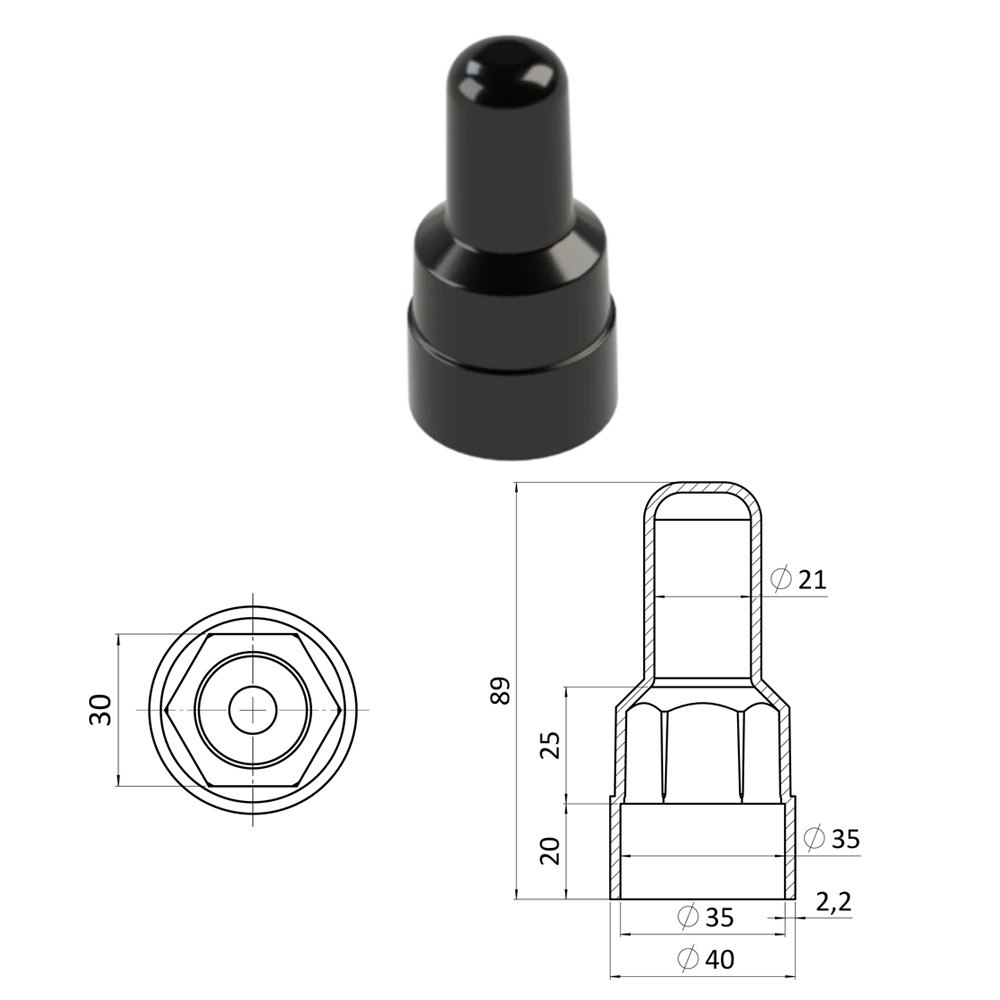 Prodloužená plastová krytka na matice a šrouby se závitem M20, výška 89 mm. Dodáváme v barvě černé RAL9005.