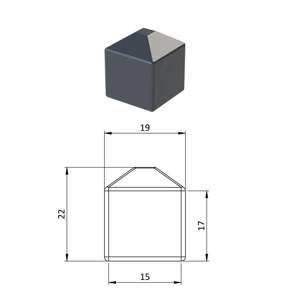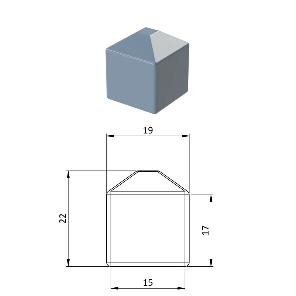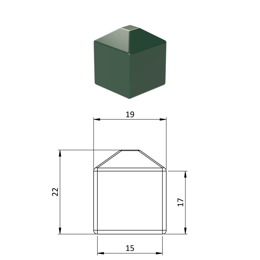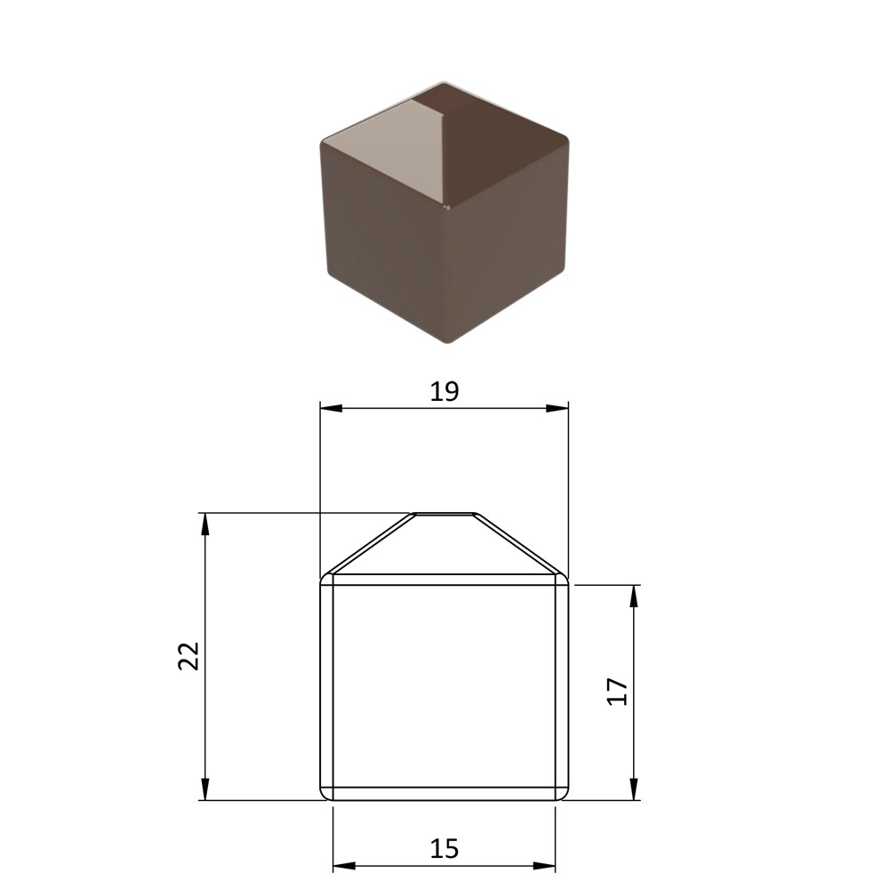 Vnější krytka převlečná plastová, rozměr 15 x 15 mm, barva černá RAL9005, antracit RAL716, hnědá RAL8028, zelená RAL 6005, šedá RAL7040.