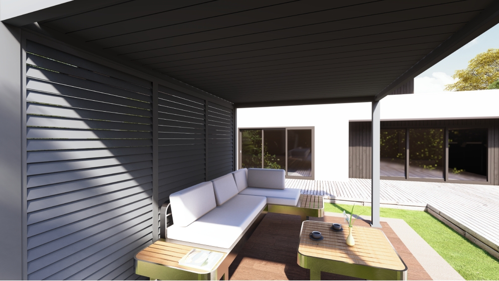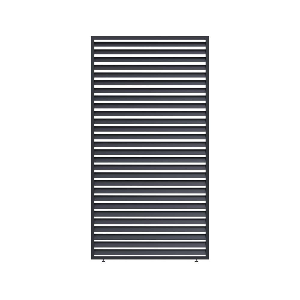 Lamelový hliníkový panel s horizontálně orientovanými fixními lamelami je ideálním doplňkem k bioklimatickým pergolám. Umožňuje vytvořit více soukromí, zlepšit ochranu proti slunci a větru a zároveň zachovat moderní a čistý vzhled venkovního prostoru. Montáž je možná na libovolnou stranu pergoly.