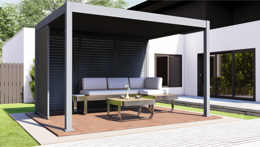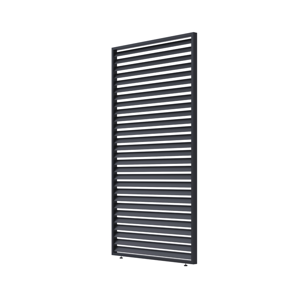 Lamelový hliníkový panel s horizontálně orientovanými fixními lamelami je ideálním doplňkem k bioklimatickým pergolám. Umožňuje vytvořit více soukromí, zlepšit ochranu proti slunci a větru a zároveň zachovat moderní a čistý vzhled venkovního prostoru. Montáž je možná na libovolnou stranu pergoly.