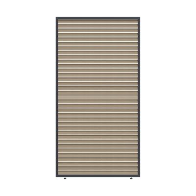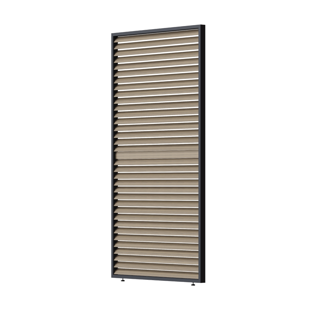 Lamelový hliníkový panel s horizontálně orientovanými otočnými lamelami je ideálním doplňkem k bioklimatickým pergolám. Umožňuje vytvořit více soukromí, zlepšit ochranu proti slunci a větru a zároveň zachovat moderní a čistý vzhled venkovního prostoru. Montáž je možná na libovolnou stranu pergoly. Elegantní vzhled díky kombinaci antracitové barvy a dekoru dřeva.