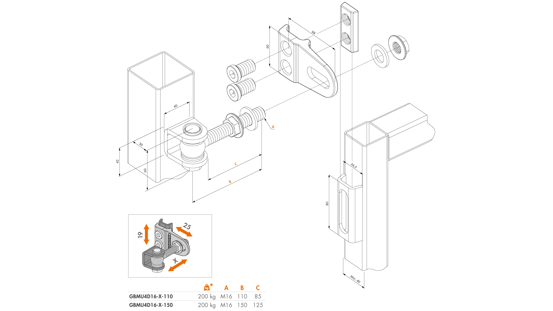 Navařovací pant LOCINOX® GBMU4D, závit M16, otevíratelný 180°, nastavitelný 3D, závěsné oko 150 mm, částečně pozinkovaný. Po instalaci je nastavitelný ve třech směrech, hloubka a vzdálenost mezi bránou a sloupkem jsou po instalaci na bránu nastavitelné o 85 mm. Nastavením pantů docílíte souběžnosti vyosených křídel (například vyosení sloupku vlivem mrazu). Žárově pozinkovaný šroub s okem a příruba. Odolnost vůči solné mlze 500 hod.