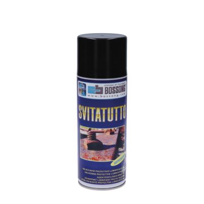 Lubrikant Bossong SVITATUTTO pro odblokování, ochranu a mazání. Je ideální na odblokování spojení, která jsou zoxidovaná nebo rezavá. Proniká okamžitě a chrání ošetřené spoje před korozí. Nepoškozuje chromové, gumové, plastové ani lakované části. Balení 400 ml.