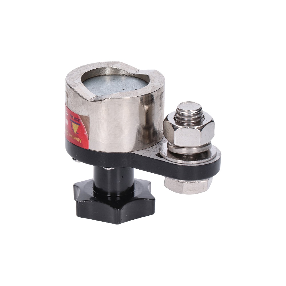Magnetická zemnící svěrka pro uzemnění při svařování, vypínatelná. Využívá silného neodymového magnetu, který dokáže pevně a spolehlivě udržet svorku na libovolné kovové ploše svařované konstrukce. Připevnění svorky k povrchu a její vypnutí se provádí otočením ovládacím kolečkem. Kovové špony nebo železný prach, které se na svorku mohou přichytit, lze snadno vyčistit díky možnosti vypnutí magnetické síly.