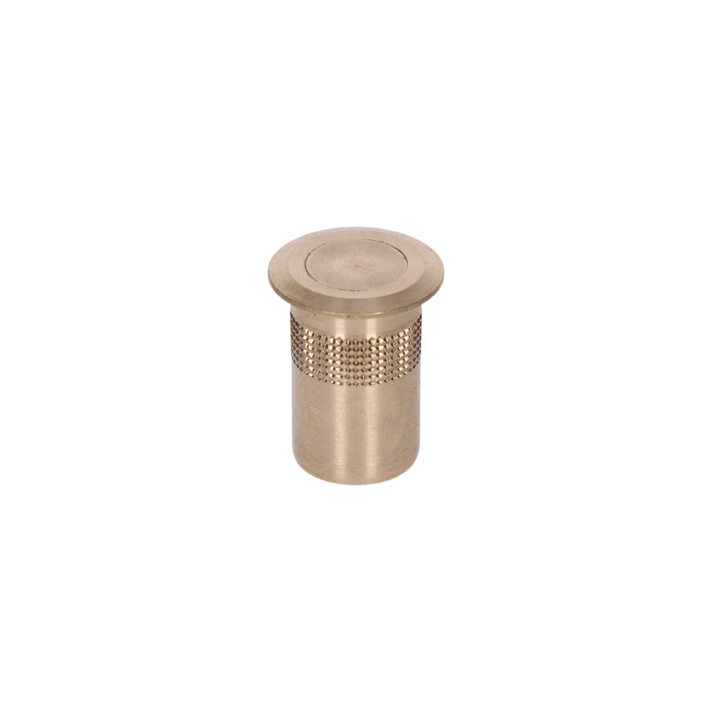 Mosazná západka k zástrčím s pružinkou a překrytím proti nečistotám, vnitřní ø 14 mm, vnější ø 18 mm, délka 30 mm, hloubka zapuštění 20 mm.