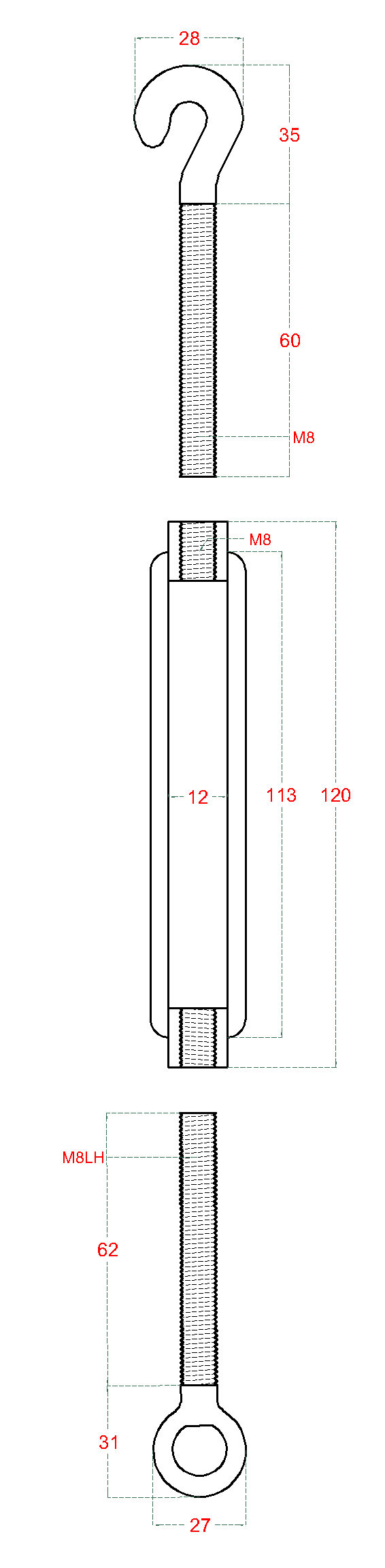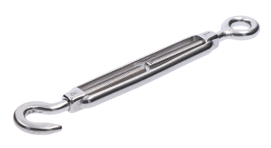 Napínáky nerezového lanka oko-hák se závity M4 - M8 a LH4 - LH8, broušená nerez K320/AISI304.