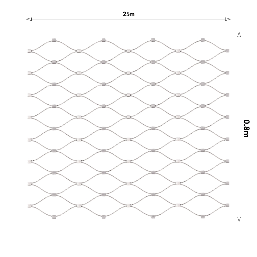 Nerezová lanková výplň, šířka 0,8 m, délka 25 m, oko 60 x 104 mm, průměr lanka 2 mm, materiál nerez AISI316. Délka sítě v nerozloženém stavu 29,8 m.