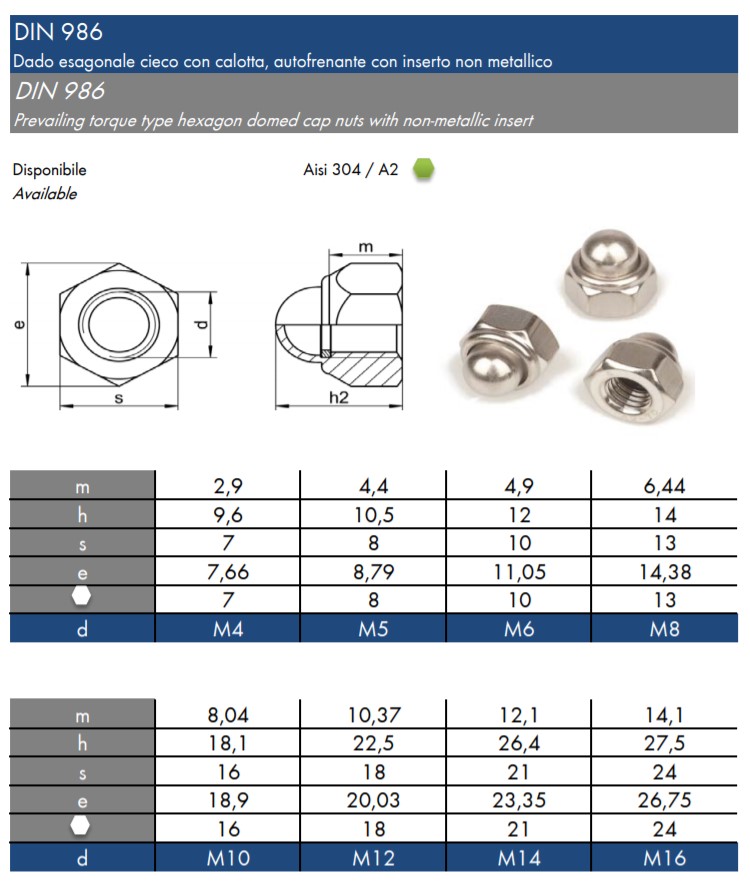 Nerezová matice uzavřená M5 - M12 s nekovovou vložkou, DIN986 / AISI304.