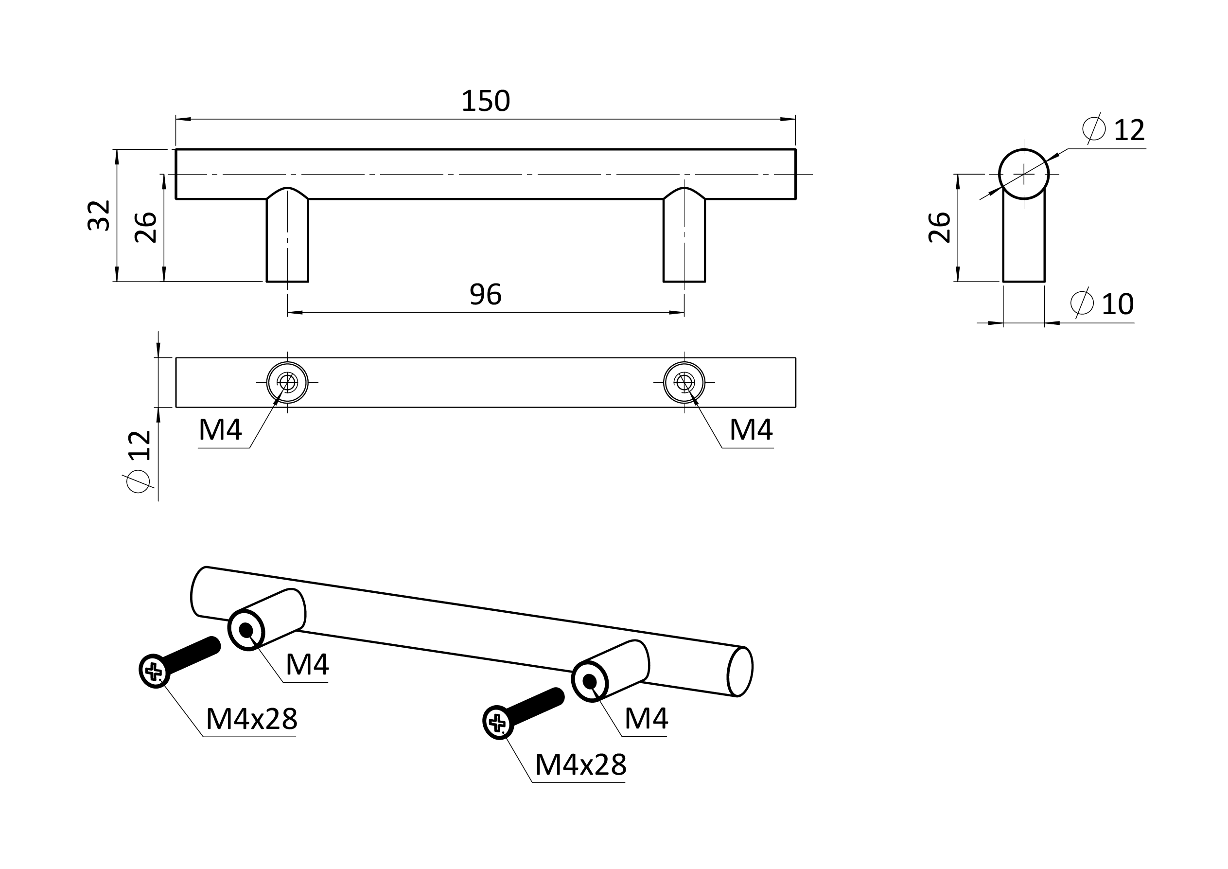 Nerezová úchytka pro rozteč 96 mm, rozměr 150 x 96 x 12 mm, výška 32 mm, dutá, broušená nerez K320 /AISI30. Balení obsahuje spojovací materiál.