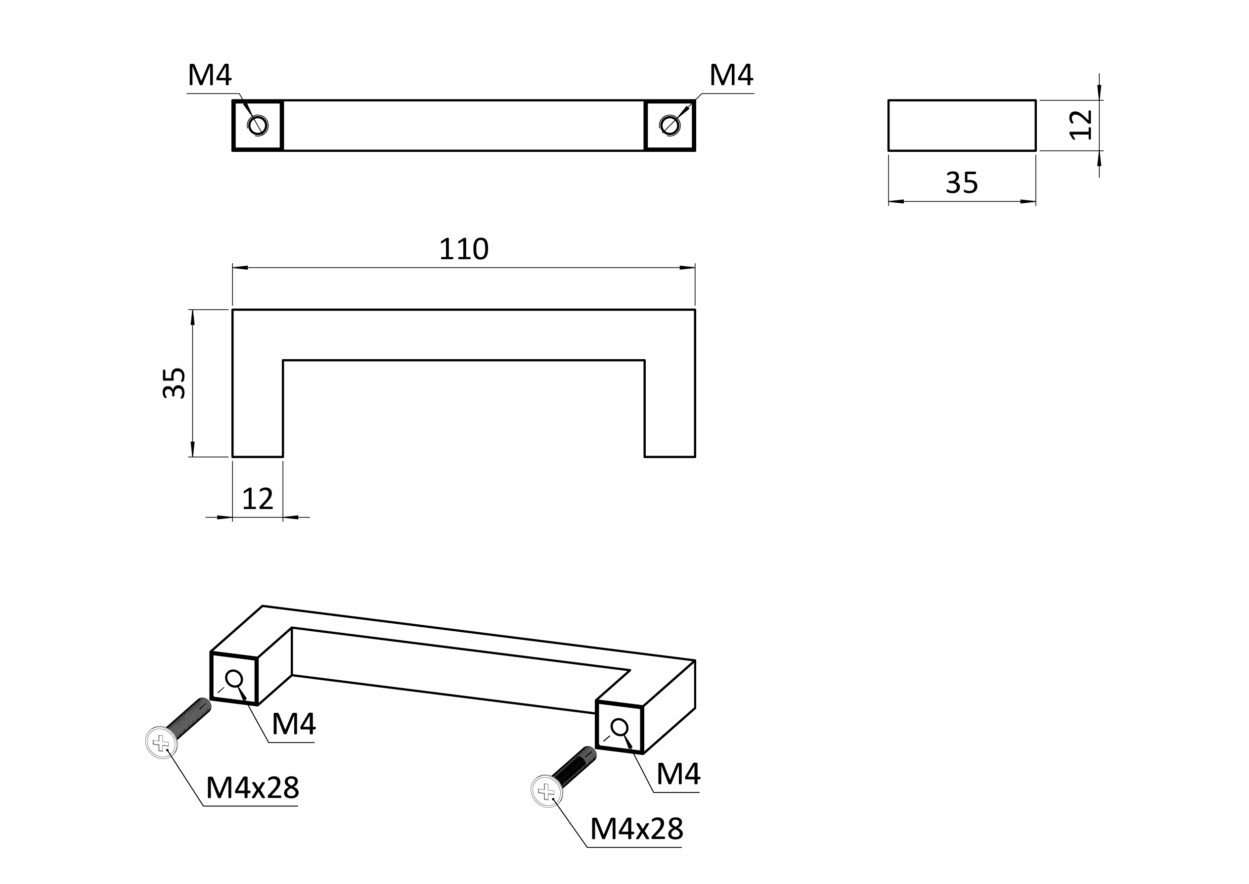 Nerezová úchytka 96 mm, rozměr 108 x 96 mm, výška 32 mm, profil madla 12 x 12 mm, dutá, barva černá, broušená nerez K320 /AISI30. Balení obsahuje spojovací materiál.