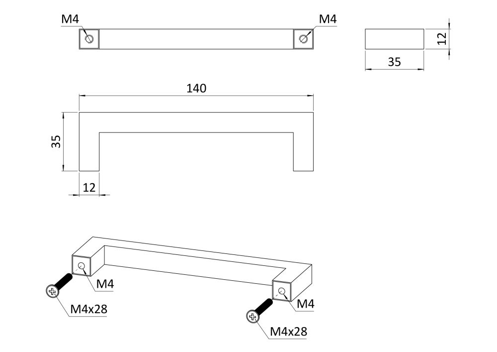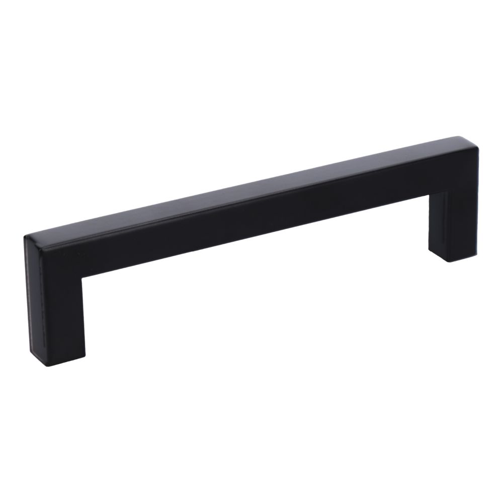 Nerezová úchytka pro rozteč 128 mm, rozměr 140 x 128 mm, výška 32 mm, profil madla 12 x 12 mm, dutá, barva černá, broušená nerez K320 /AISI30. Balení obsahuje spojovací materiál.