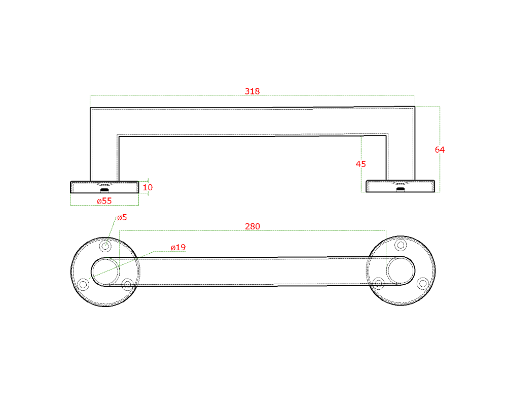 EB1-KMA41 - nerezové madlo, délka 318 mm, výška 64 mm, ø 19 mm, materiál broušená nerez K320 /AISI304.