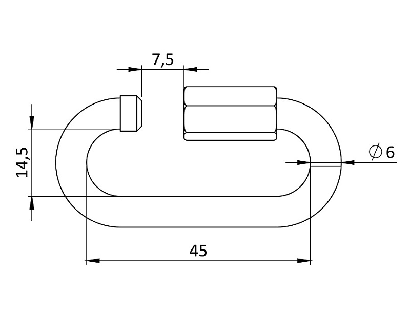 Rychlouzávěr pro řetěz, průměr mat. 6 mm, materiál AISI316, nosnost 150 kg, max. zatížení 1130 kg.