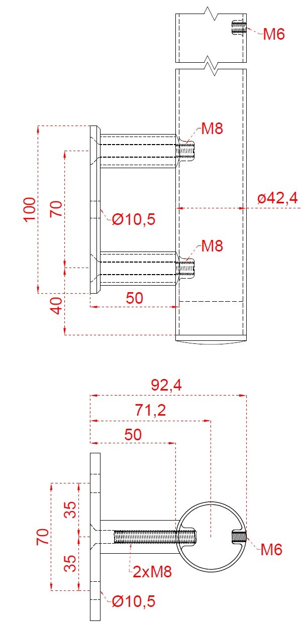 Součástí sloupku je navařená příruba pro boční kotvení, krytka a držák madla. Dodávka neobsahuje kotevní materiál.