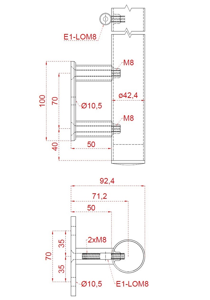 Nerezový sloupek zábradlí kulatý s bočním kotvením pro výplň z lankové sítě - 2 x úchyt LOM8, průcho...Ukaž celý popis >