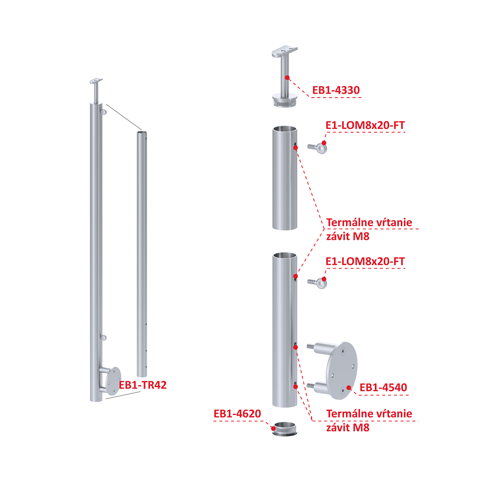 Nerezový sloupek zábradlí kulatý s bočním kotvením pro výplň z lankové sítě - 2 x úchyt LOM8, průchozí a koncový, vrch pevný (držák madla bez nastavení sklonu), materiál broušená nerez K320 /AISI304.