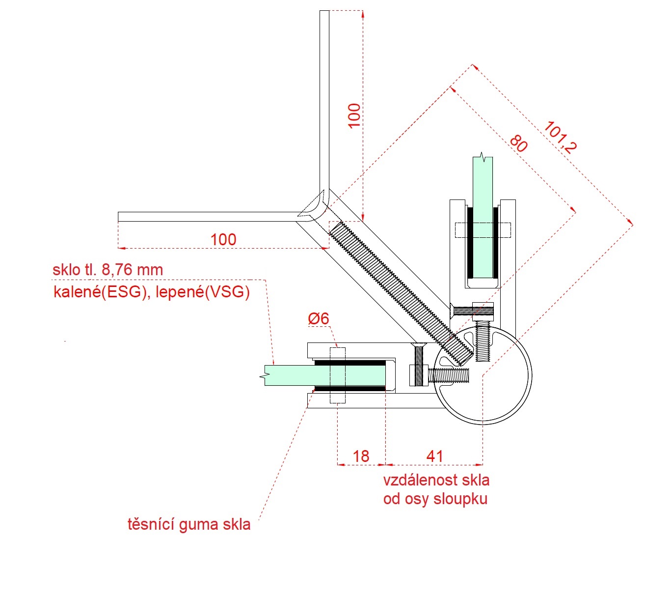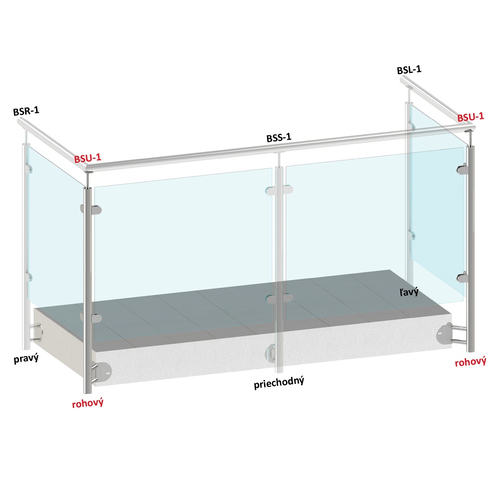 Součástí dodávky je příruba pro boční kotvení, spodní krytka, 4 držáky skleněné výplně (svorky) a držák madla pevný. Dodávka neobsahuje kotevní materiál.