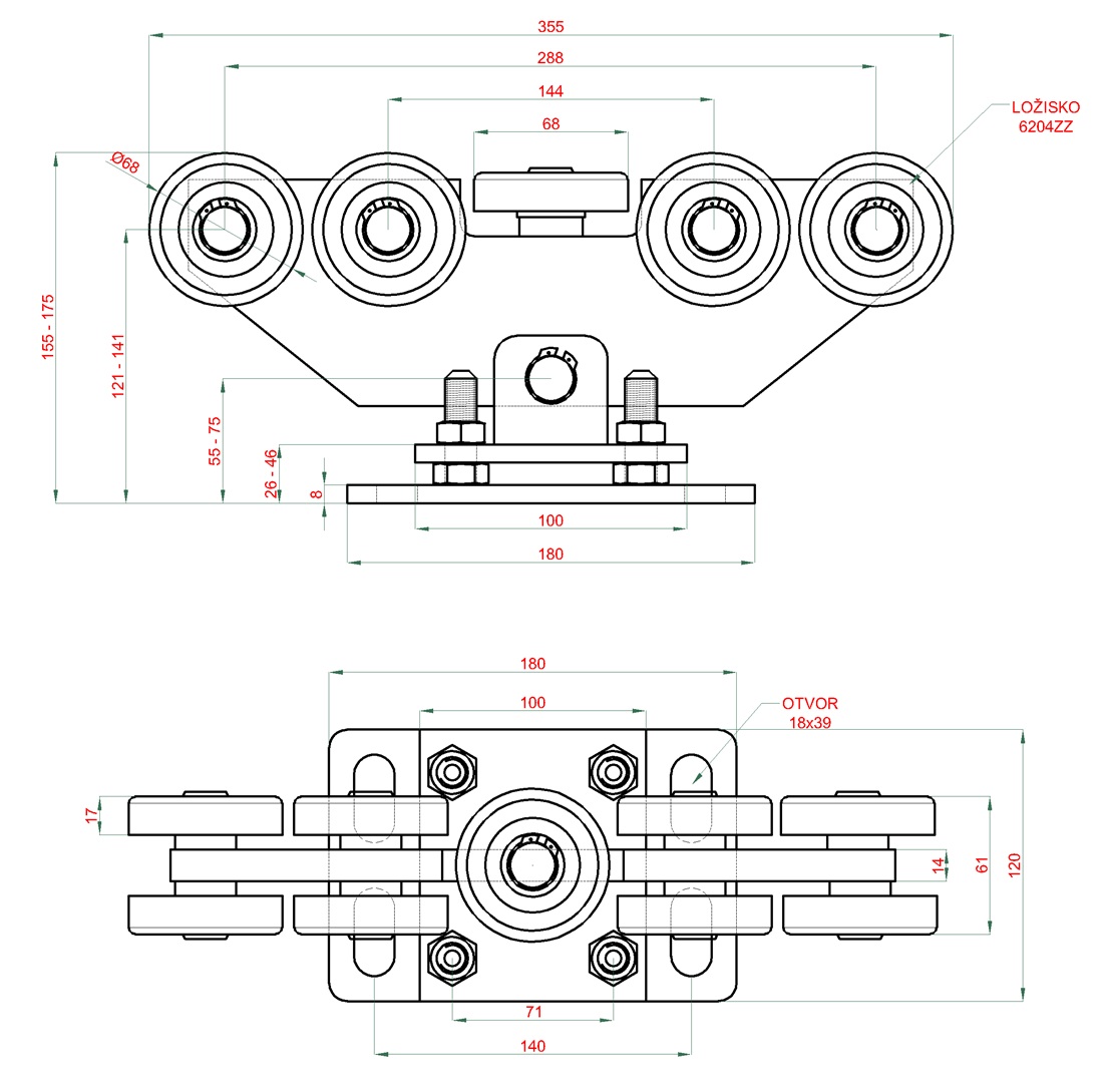 W3999F.80 - nosný kyvný, výškově stavitelný vozík pro C profil 80 x 80 x 5 mm, ocelová kolečka s ložiskem 6204ZZ, povrch - galvanické zinkování.