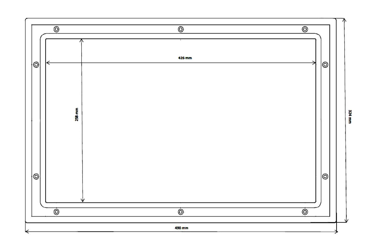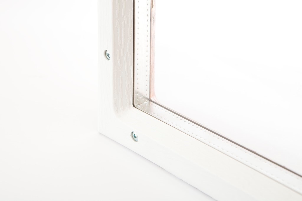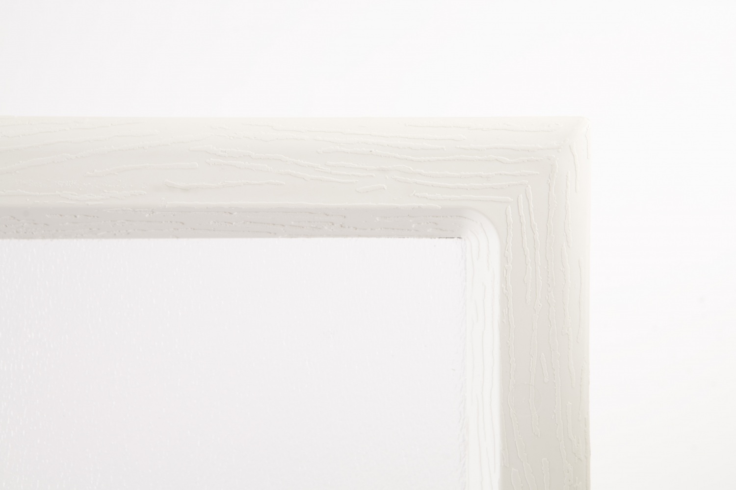 Hranaté okno do vrat s rámečkem woodgrain (struktura), barva bílá RAL 9016, materiál rámečku plast, vnější rozměr 490 x 324 mm, pro sekce tl. 40 - 45 mm dvojité prosklení, 60 mm trojité prosklení. Velikost výřezu 468 x 298 mm. Vnější rám opatřený těsněním je vhodný pro plochý montážní povrch s nerovnostmi do 1 mm. Pro větší nerovnost panelu se doporučuje použít dodatečné těsnění.