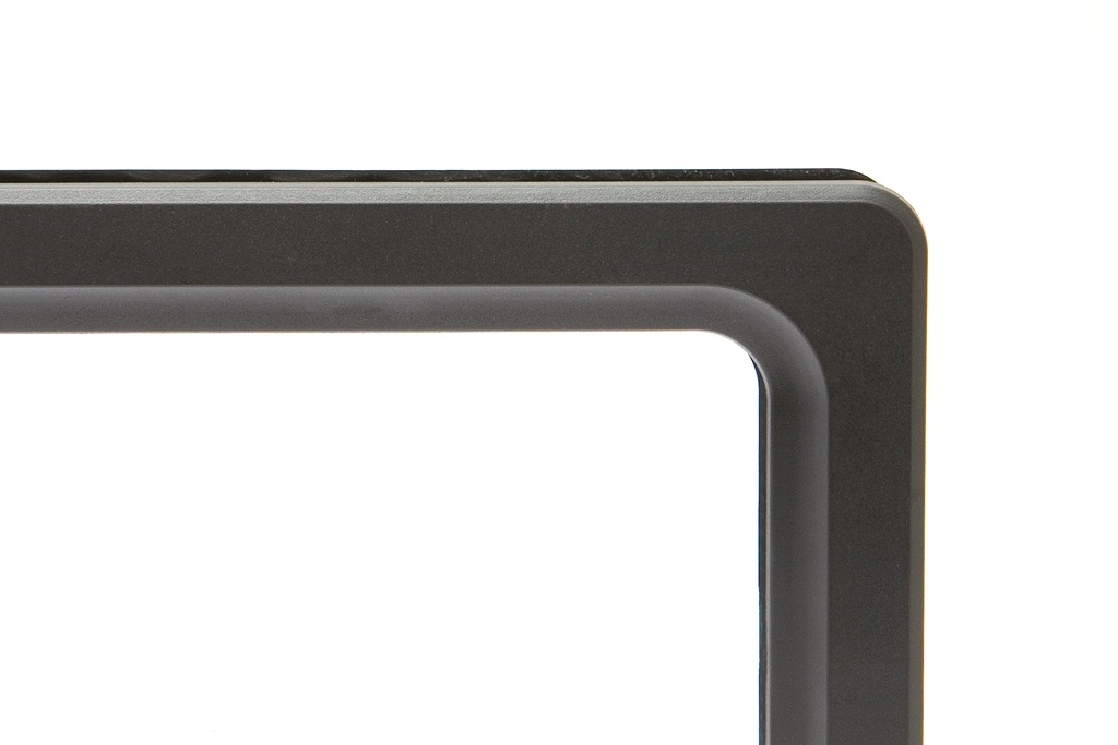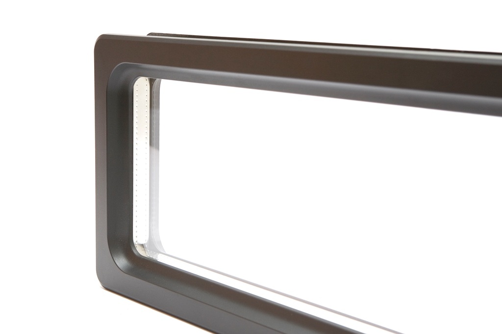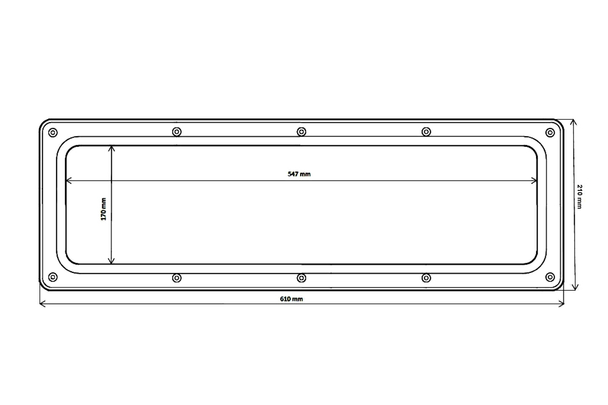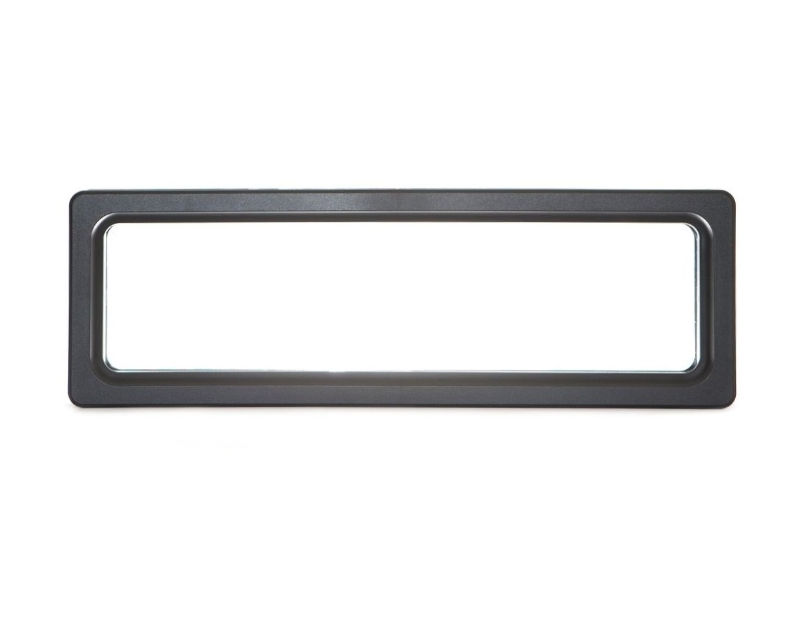 Hranaté úzké okno do průmyslových vrat s hladkým rámečkem, barva černá RAL 9005, materiál rámečku ABS, vnější rozměr 610 x 203 mm, velikost výřezu 588 x 180 mm. Vnější rám opatřený těsněním je vhodný pro plochý montážní povrch s nerovnostmi do 1 mm. Pro větší nerovnost panelu se doporučuje použít dodatečné těsnění.