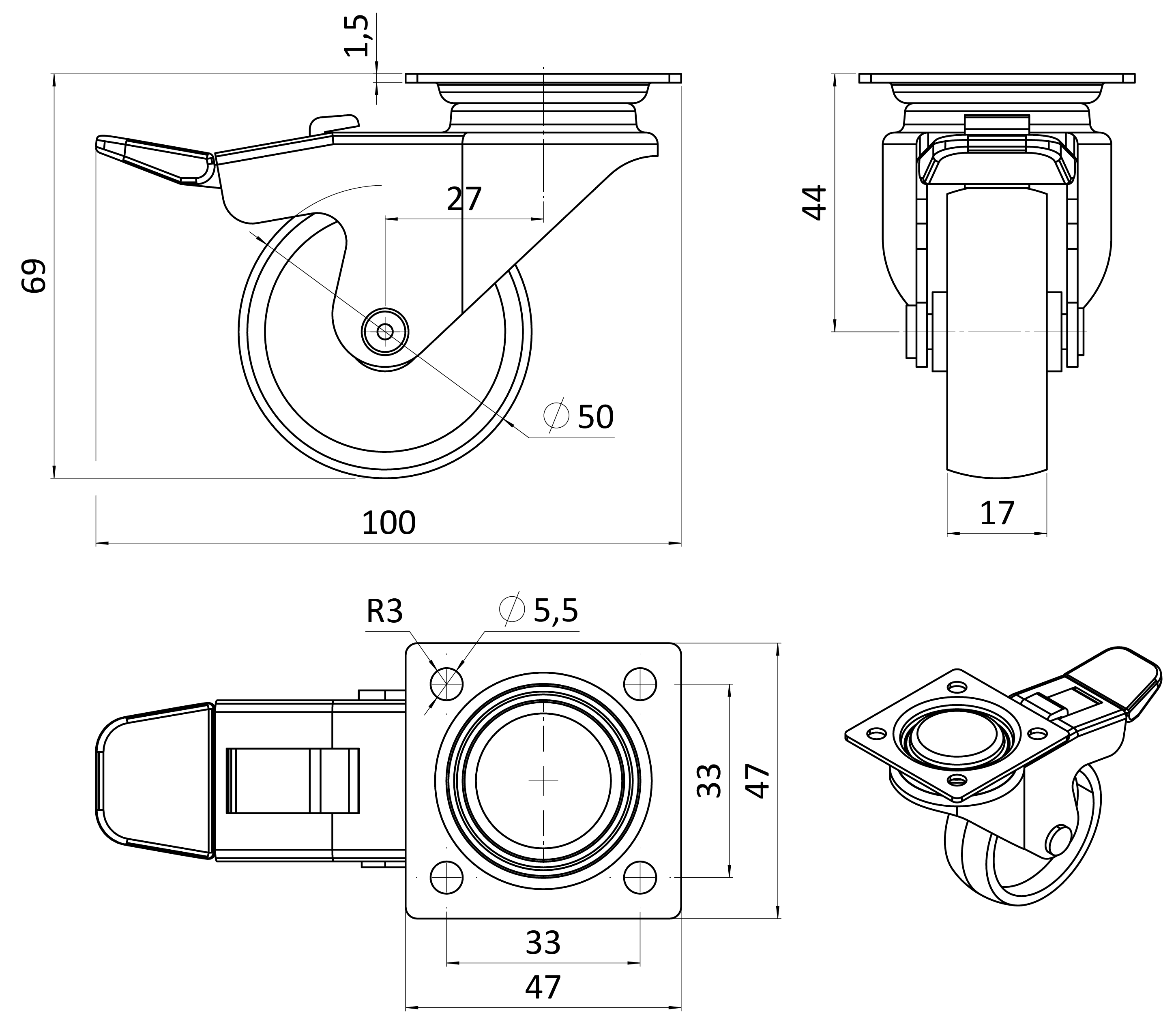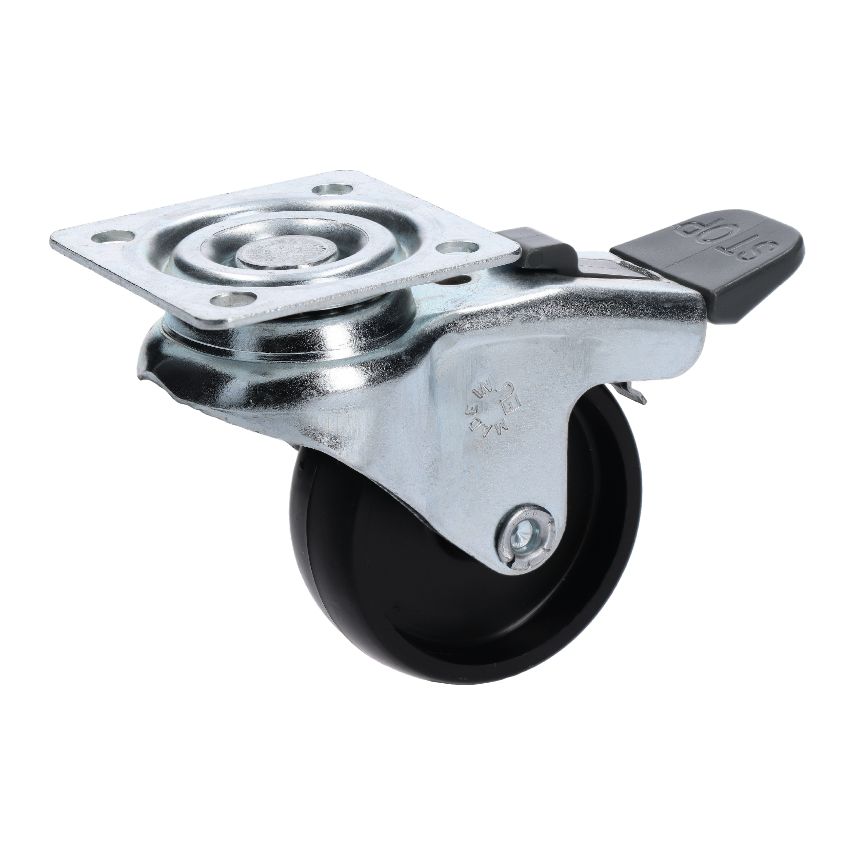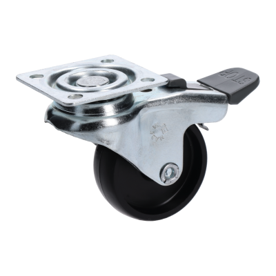 Otočné kolečko s montážní deskou a brzdou, materiál kolečka polypropylen, barva černá. Ideální pro elektronické skříňky nebo polypropylenové aplikace v obchodech a pro polypropylenové aplikace, kde se vyžadují silná kolečka s nízkým lůžkem. Vidlice z pozinkované oceli.