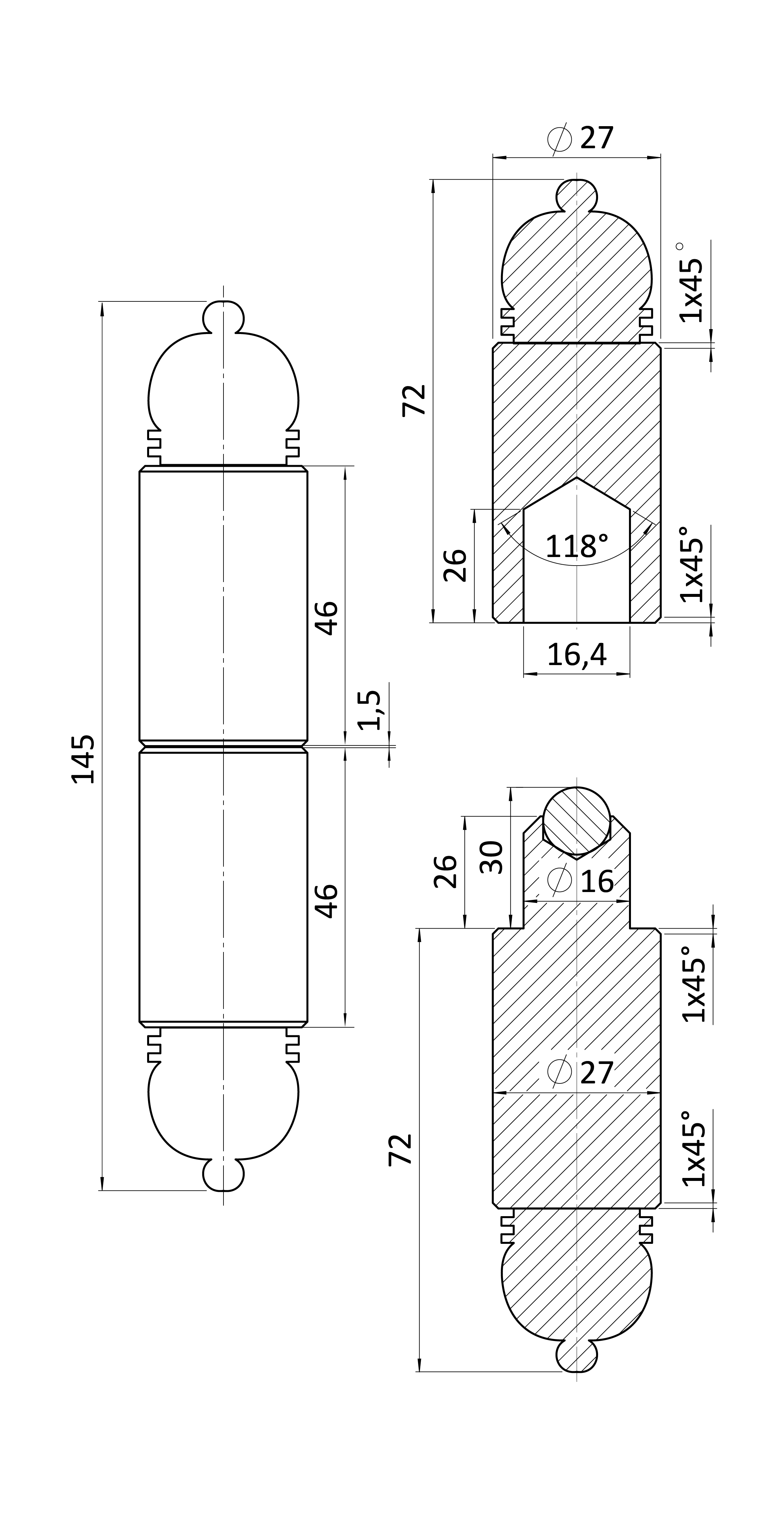 P612G - ozdobný navařovací závěs s kuličkou, délka 145 mm, průměr 27 mm, průměr čepu 16 mm, max. zatížení 80 kg/pár. Ocel bez povrchové úpravy.