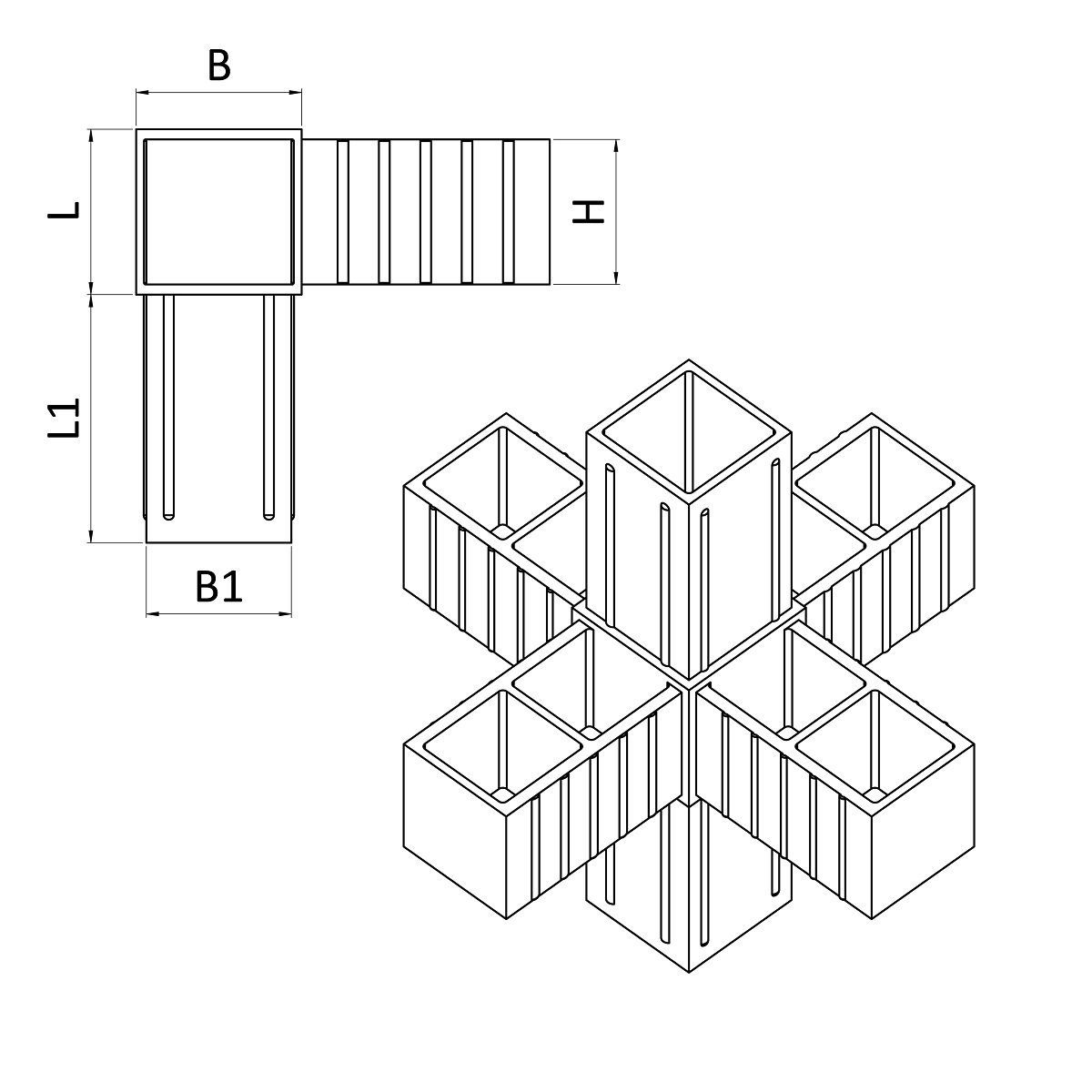 | Typ | do profilu | L1 (mm) | B1 (mm) | B (mm) | H (mm) | L (mm) |
