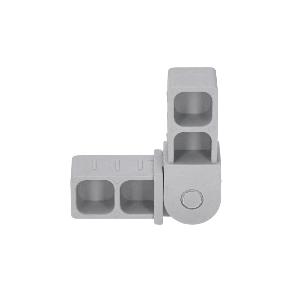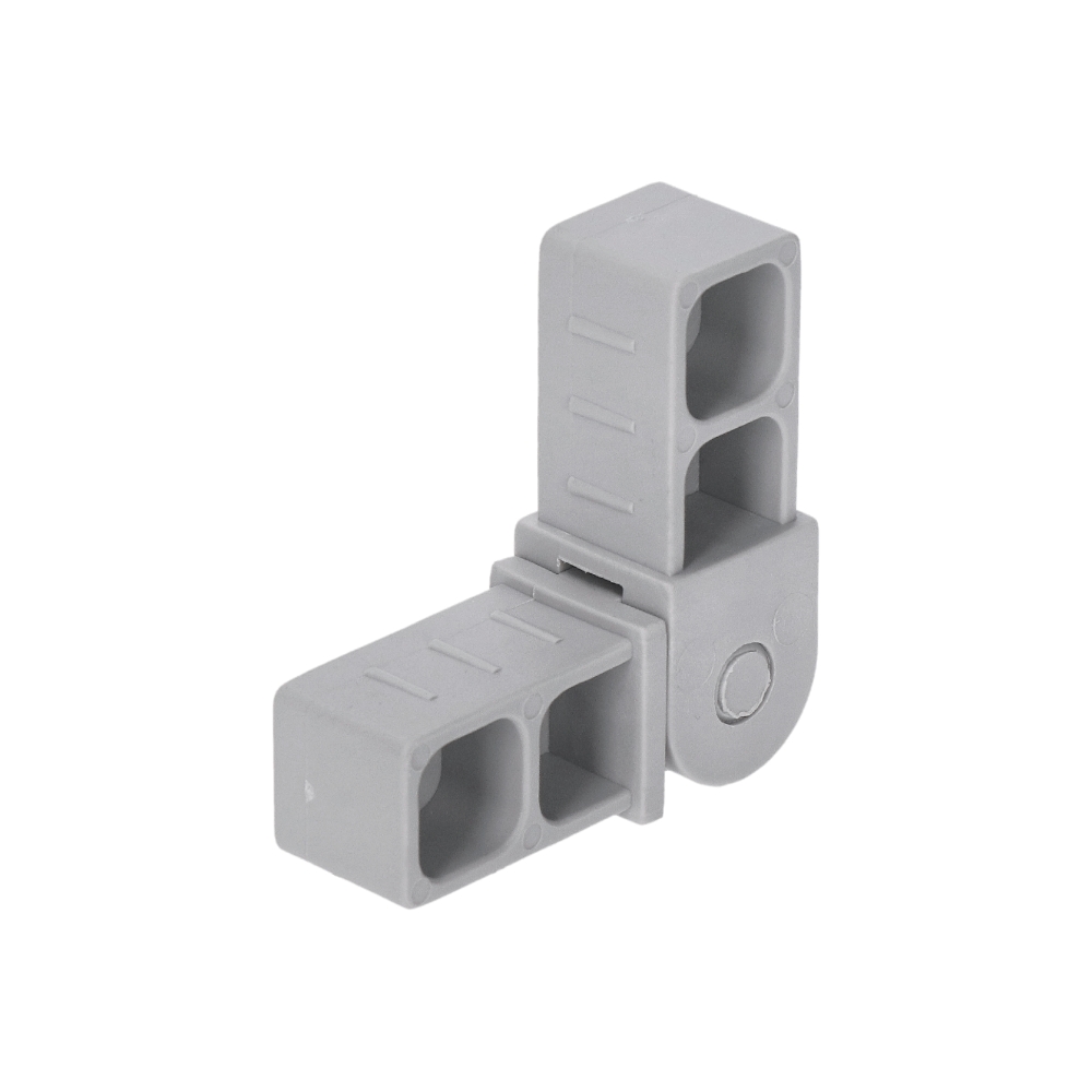 Pohyblivá plastová spojka šedé barvy pro spojení čtyřhranných hliníkových profilů, vhodná do profilu velikosti 20 x 20 x 1,5 mm. Vhodné např. pro stavbu regálů, stolů apod. Spojku je nutné do profilu zatloukat gumovou nebo dřevěnou palicí.