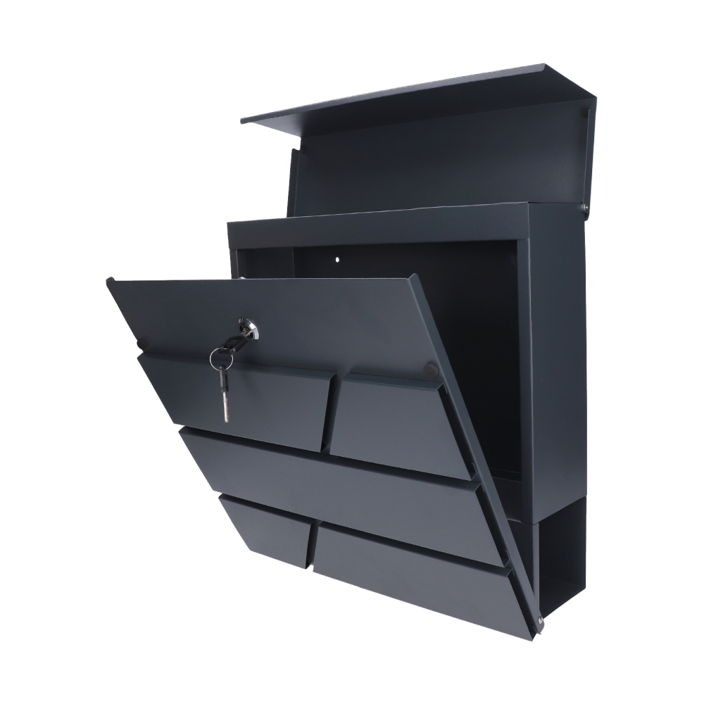Poštovní schránka z pozinkované oceli s práškovým nástřikem v barvě antracit RAL 7016. Kvalitní materiál, ze kterého je schránka vyrobená, zaručuje odolnost vůči povětrnostním podmínkám a dlouhou životnost. Výborně řešený horní kryt chrání korespondenci i zámek před vlhkostí. Dolní část schránky je určená pro noviny a letáky. Ze zadní strany schránky jsou montážní otvory, což umožňuje jednoduchou a rychlou montáž. Součástí balení jsou 2 klíče, montážní šrouby a gumové rozpěrky. Schránka je vhodná do venkovního prostředí.