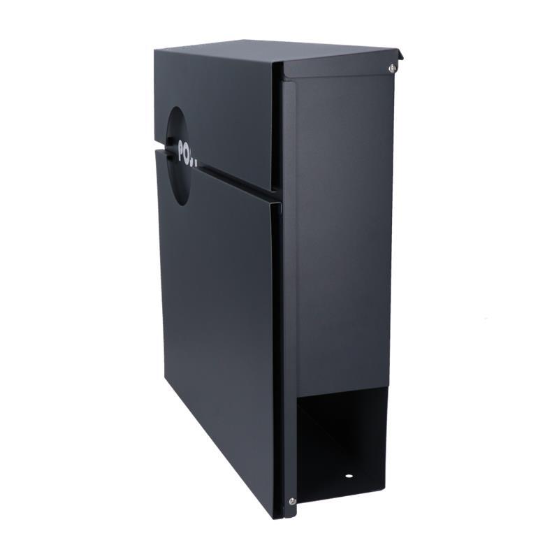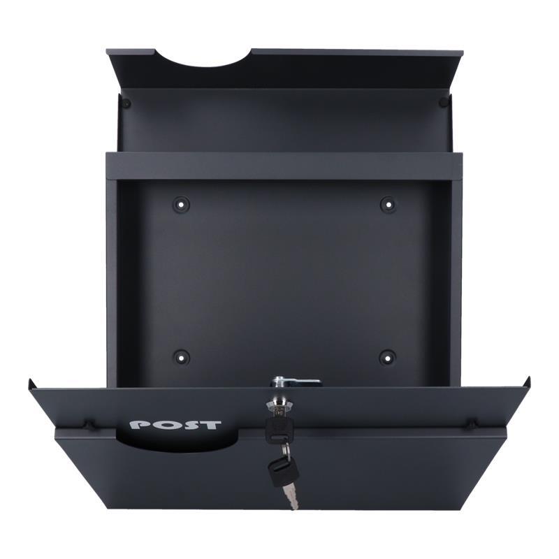 Poštovní schránka z pozinkované oceli v barvě antracit RAL 7016. Kvalitní materiál, ze kterýho je schránka vyrobená, zaručuje odolnost vůči povětrnostním podmínkám a dlouhou životnost. Výborně řešený horní kryt chrání korespondenci i zámek před vlhkostí. Dolní část schránky je určená pro noviny a letáky. Ze zadní strany schránky jsou montážní otvory, což umožňuje jednoduchou a rychlou montáž. Součástí balení jsou 2 klíče, montážní šrouby a gumové rozpěrky. Schránka je vhodná do venkovního prostředí.
