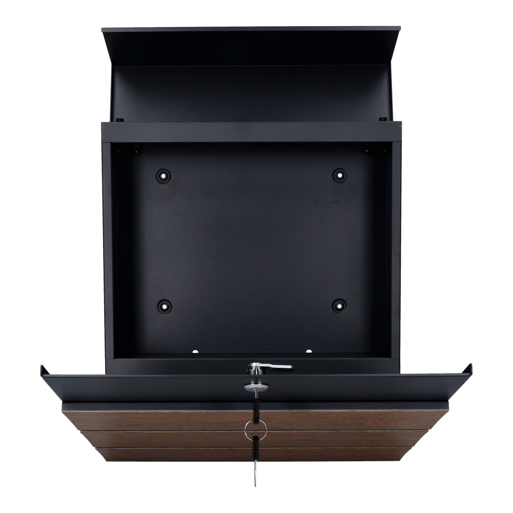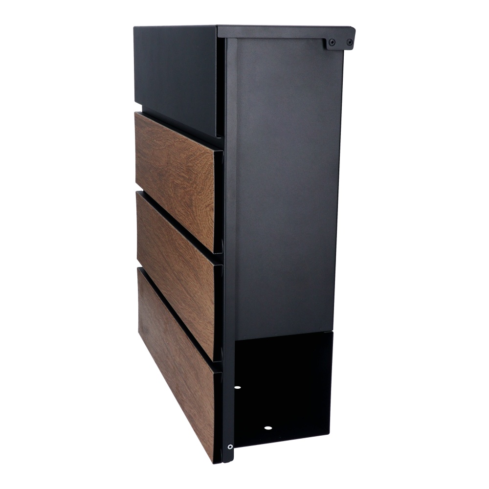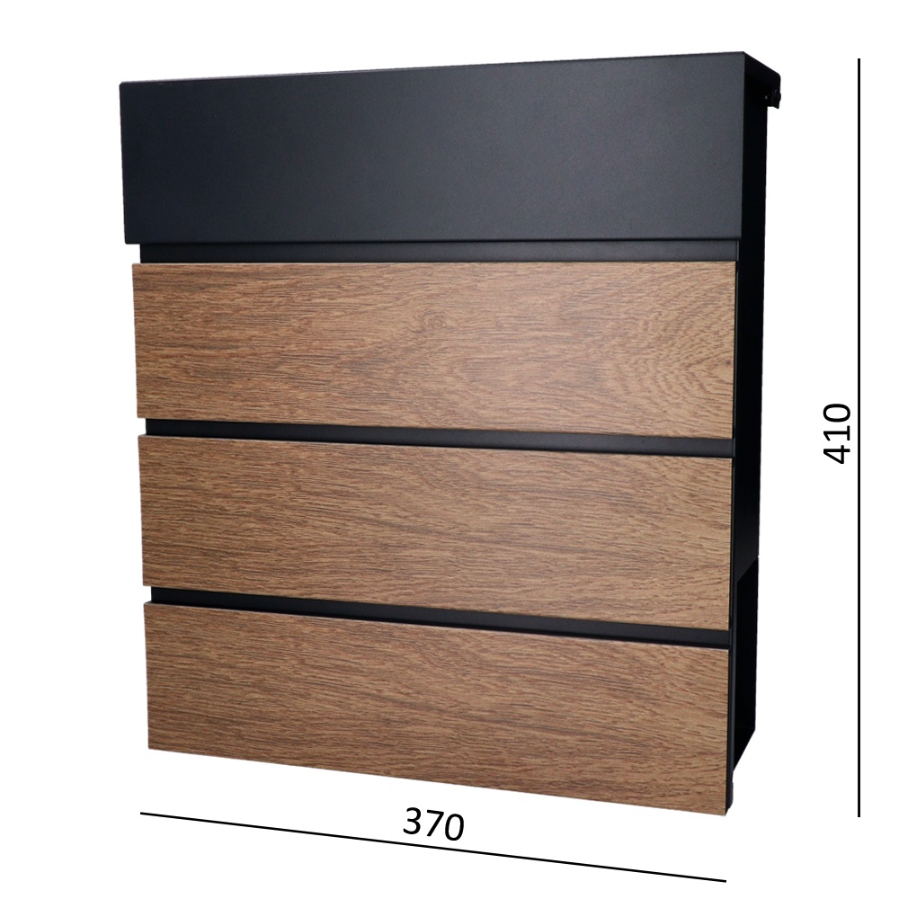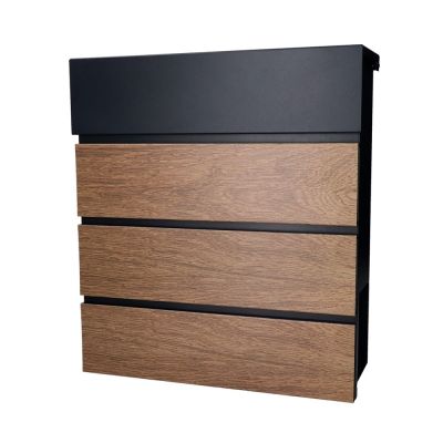 Poštovní schránka z pozinkované oceli s práškovým nástřikem v kombinaci barvy antracit RAL 7016 a imitace dřeva. Kvalitní materiál, ze kterého je schránka vyrobená, zaručuje odolnost vůči povětrnostním podmínkám a dlouhou životnost. Výborně řešený horní kryt chrání korespondenci i zámek před vlhkostí. Dolní část schránky je určená pro noviny a letáky. Ze zadní strany schránky jsou montážní otvory, což umožňuje jednoduchou a rychlou montáž. Součástí balení jsou 2 klíče, montážní šrouby a gumové rozpěrky. Schránka je vhodná do venkovního prostředí.