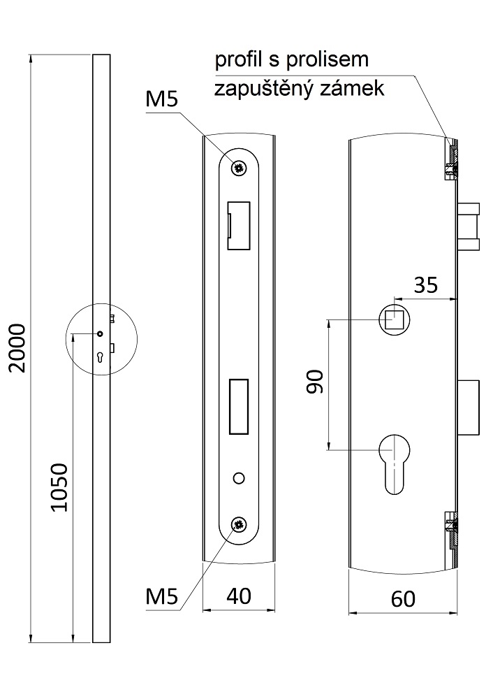 Pozinkovaný profil 60 x 40 x 1,5 mm, délka 1,5 m nebo 2 m, zámek s roztečí 90 mm, vhodné pro rám branky. Oboustranné použití zámku.