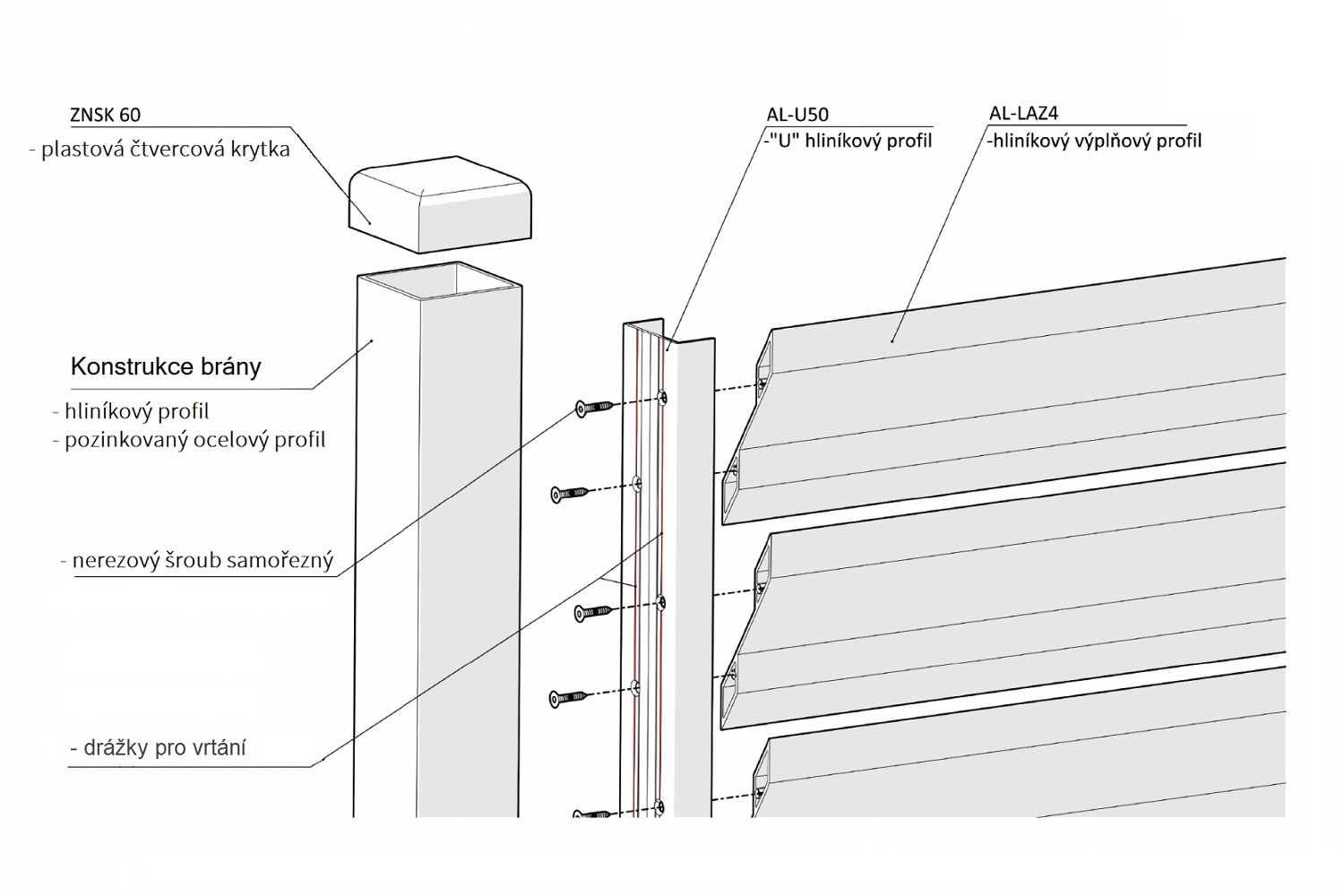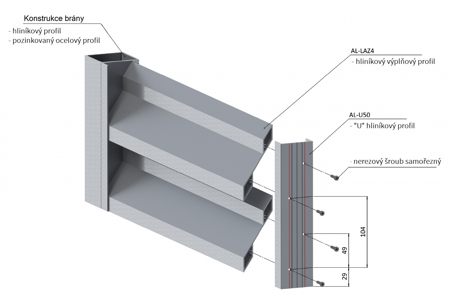 Lamelu AL-LAZ4-6 je možné montovat jako výplň v kombinaci s U profily AL-U29-6 a AL-U50-6. Pokud se rozhodnete spojovat více polí s lamelovou výplní, doporučujeme využít spojovací UT profily. V naší nabídce najdete UT profily se šířkou 29 mm a 50 mm.