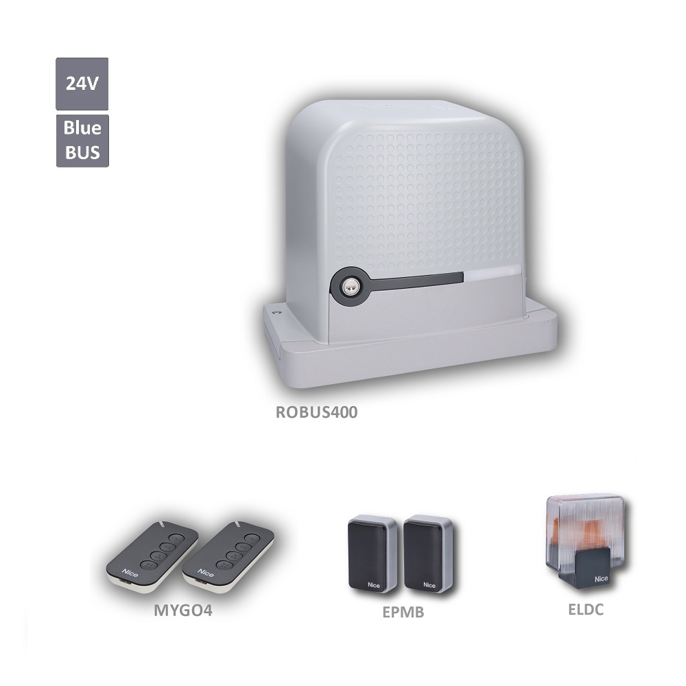 RBS400BDKCE - sada pohonu Nice Robus (nový typ) s dálkovým ovládáním, fotobuňkami, majákem pro posuvnou bránu do hmotnosti 400 kg. Technologie BlueBus, magnetické koncové spínače. Pohon nahrazuje starší typ ROBUS 400. Ovládání brány je u pohonu RBS400 možné prostřednictvím aplikace MyNice.