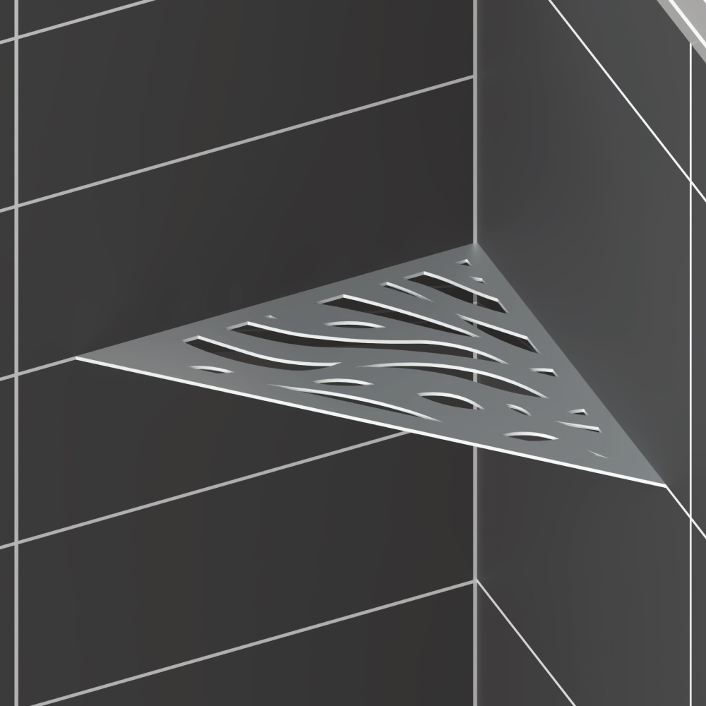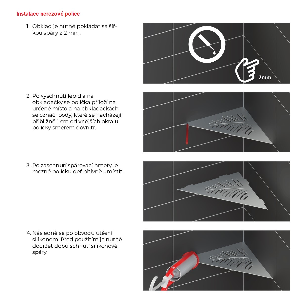 Nerezová rohová police do spár, rozměr 210 x 210 mm, tl. 2 mm, materiál broušená nerez K320/AISI304....Ukaž celý popis >