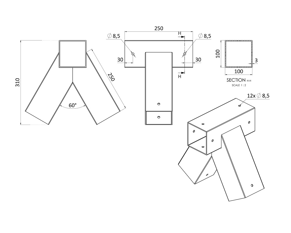 Spojka dodávaná v pozinkovaném provedení, s možností dodatečného nátěru, vyrobeno z profilu 100 x 100 x 3 mm.