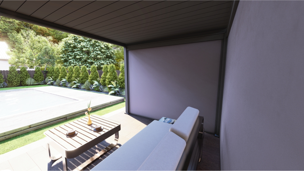 Boční clonu lze přidat na libovolnou stranu pergoly - od jedné až po všechny čtyři. Clona účinně tlumí vítr a chrání před nepříznivým počasím.