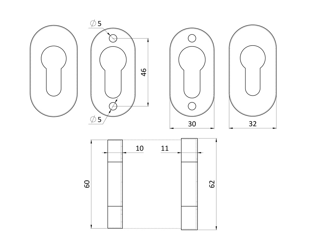 EB1-KGS1N - oválná rozeta na cylindrickou vložku 62 x 32 mm, broušená nerez K320/AISI304, nerezová i spodní část, vhodné i do venkovního prostředí.