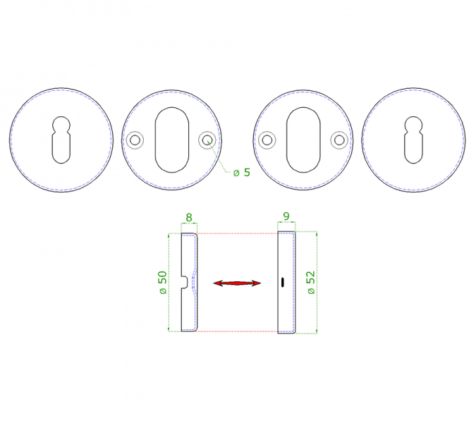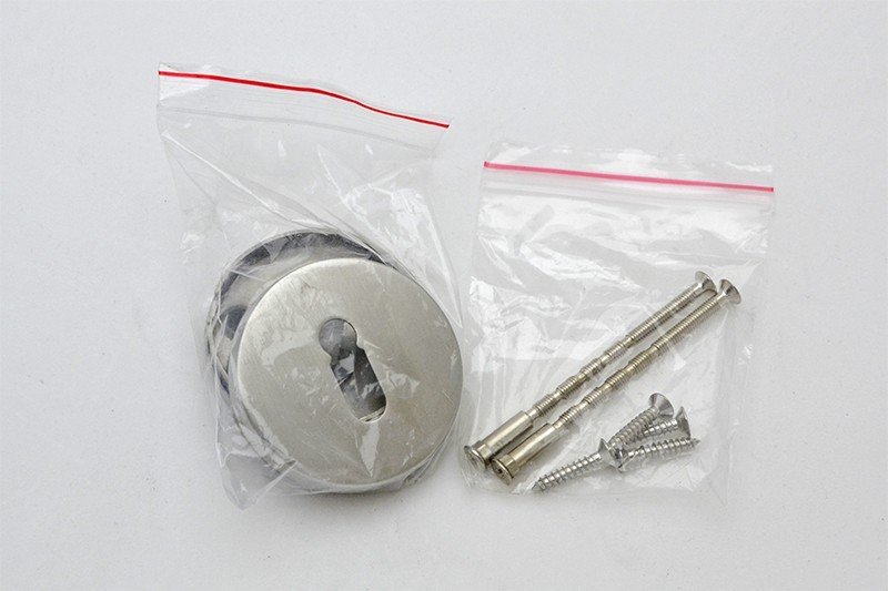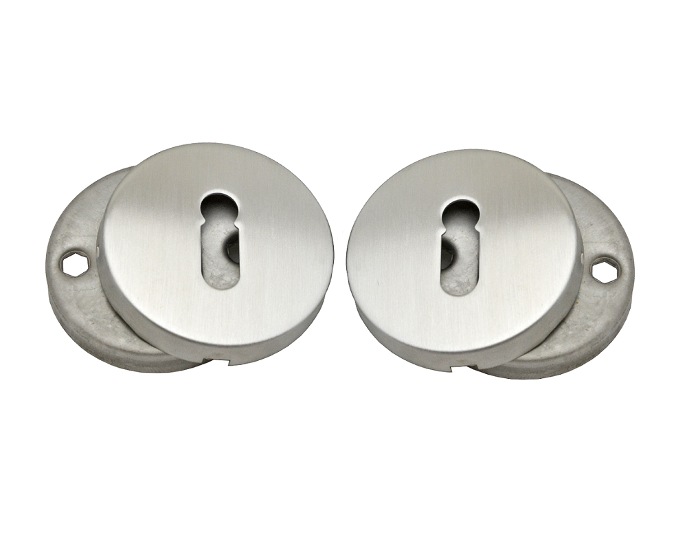 EB1-KGK9 - rozeta na dozický zámek ø 52 mm, broušená nerez K320/AISI304, spodní část pozink, vhodné i do venkovního prostředí. Balení obsahuje 2 ks rozet + příslušenství k montáži.