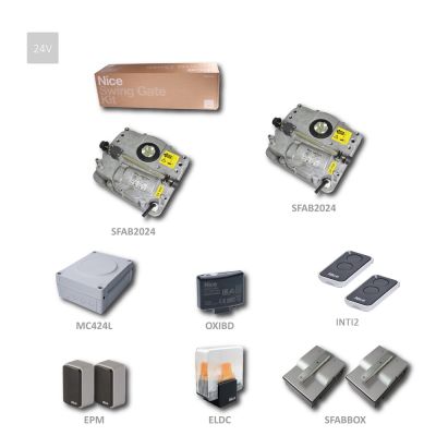 S-FAB2024 - sada podzemních 24V pohonů Nice s dálkovým ovládáním se zpětnou vazbou, fotobuňkami a majákem pro dvoukřídlou bránu do šířky křídla 2,3 m a hmotnost křídla do 400 kg.