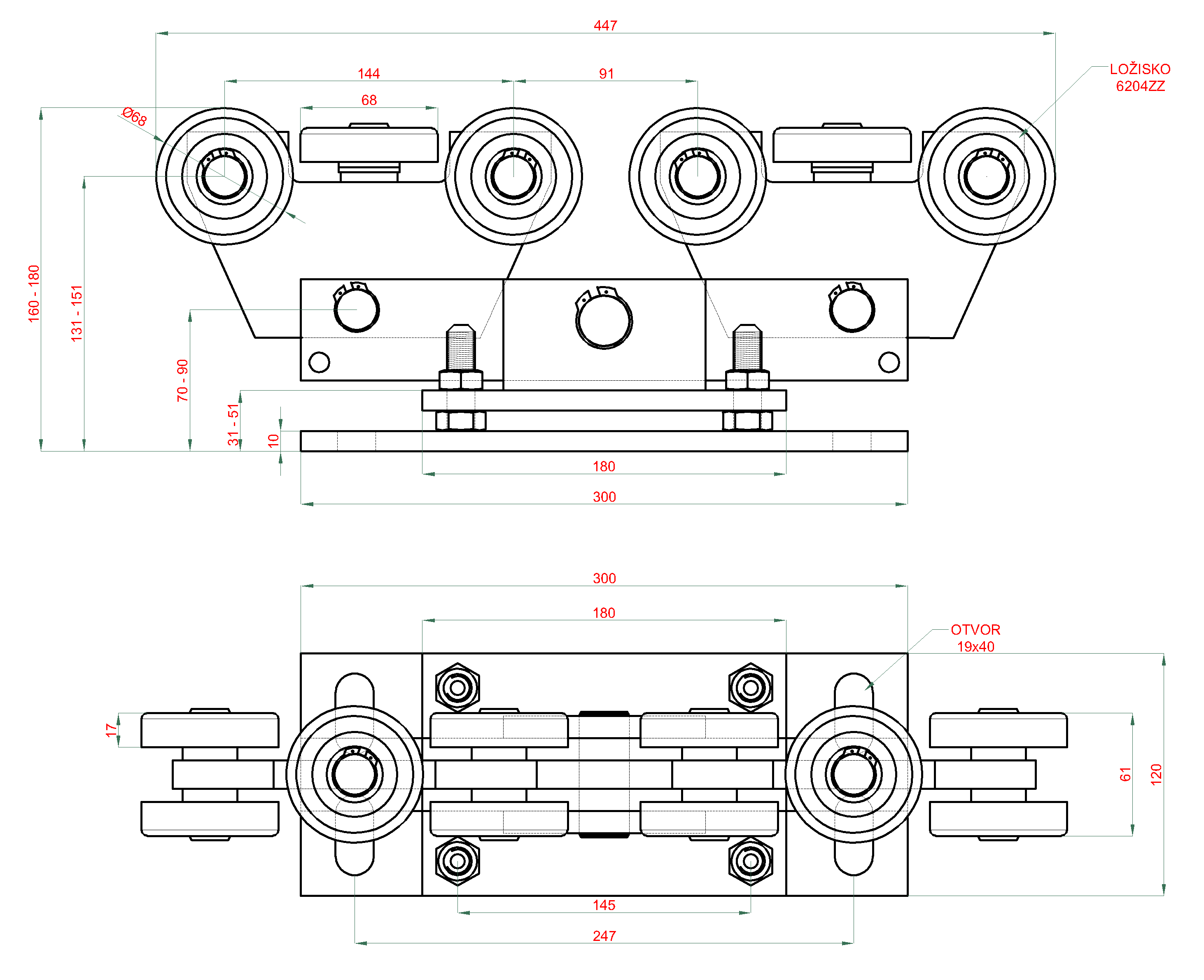 - 2 x kyvný, výškově stavitelný 10-kolečkový vozík s ložiskem 6204ZZ, W3910F.80