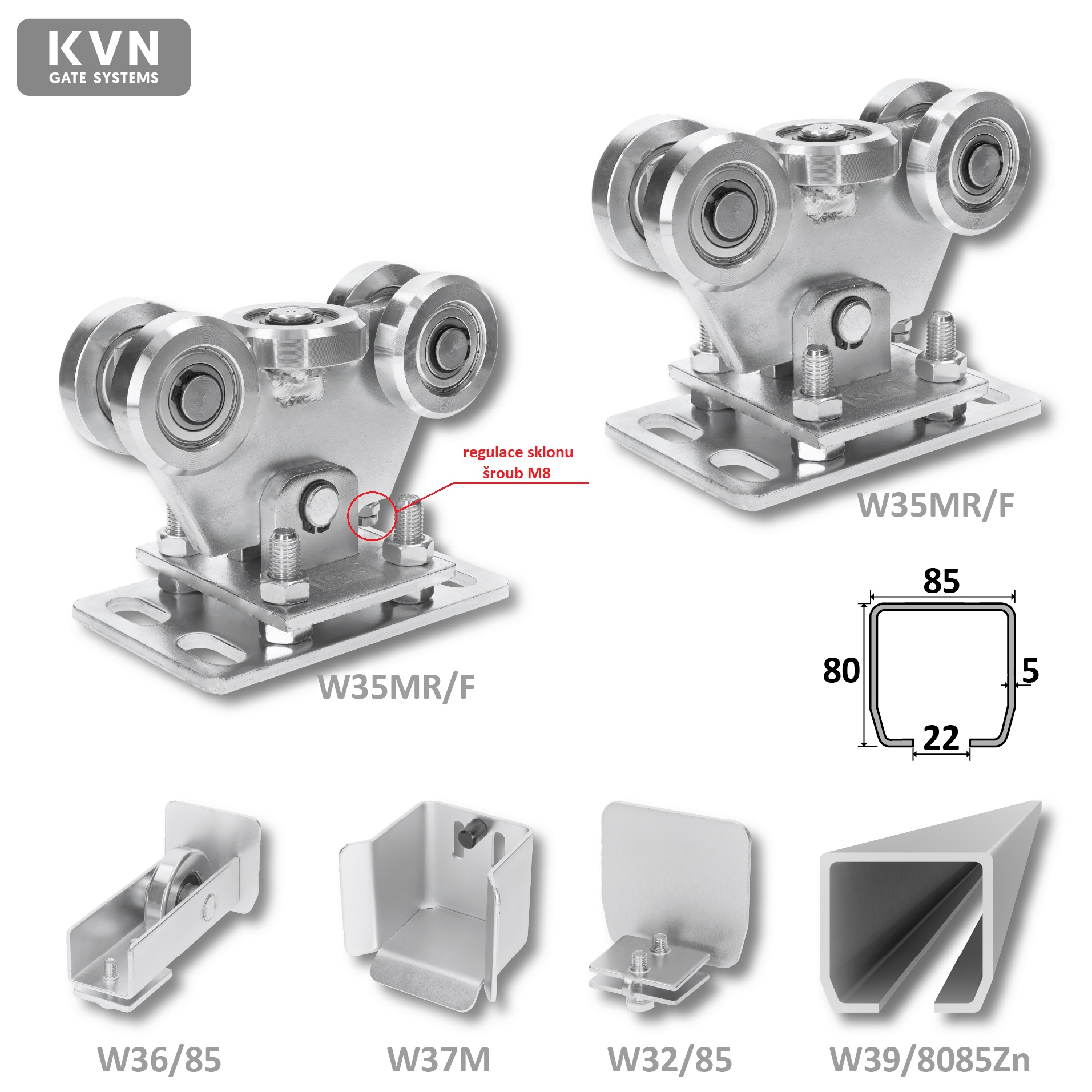 Set85/Zn-F - kompletní sada kování pro samonosnou bránu o průjezdu do 6 metrů a hmotnosti do 550 kg.