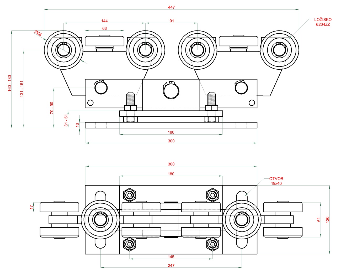 - 2 x vozík kyvný 10-kolečkový výškově stavitelný W3910F.80 s ložiskem 6204ZZ