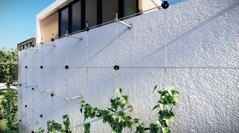 Lanková stěna pro zeleň - tzv. zelená stěna, rozměr 2 x 2 m, kompletní set. Materiál lanko ø 4 mm, nerez AISI316, úchyty lanka broušená nerez K320/AISI304 a plastové spojky lanka. Při sestavení lankové stěny se příruby umísťují ve vzdálenosti cca 50 x 50 cm a plastové spojky také 50 x 50 cm od sebe. Celkově tak vzniknou oka 25 x 25 cm. Tyto vzdálenosti lze měnit podle potřeby nebo prostoru na stěně.