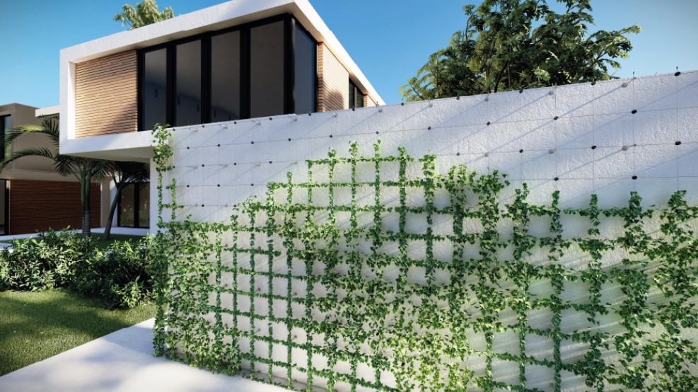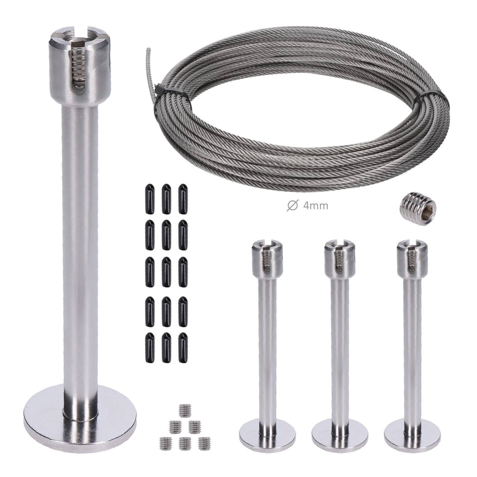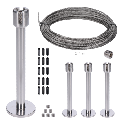 Lanková stěna pro zeleň - tzv. zelená stěna, rozměr 2 x 1 m, kompletní set. Materiál lanko ø 4 mm, nerez AISI316, úchyty lanka broušená nerez K320/AISI304. Při sestavení lankové stěny se kotvící příruby umísťují ve vzdálenosti cca 50 x 50 cm od sebe. Tyto vzdálenosti lze měnit podle potřeby nebo prostoru na stěně.