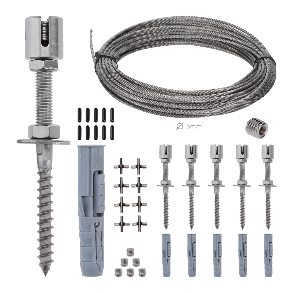 Lanková stěna pro zeleň - tzv. zelená stěna, rozměr 2 x 2 m, kompletní set. Materiál lanko ø 3 mm, nerez AISI316, úchyty lanka broušená nerez K320/AISI304 + speciální hmoždinky a nerezové křížové spojky lanka. Při sestavení lankové stěny se příruby umísťují ve vzdálenosti cca 50 x 50 cm a plastové spojky také 50 x 50 cm od sebe. Celkově tak vzniknou oka 25 x 25 cm. Tyto vzdálenosti lze měnit podle potřeby nebo prostoru na stěně.